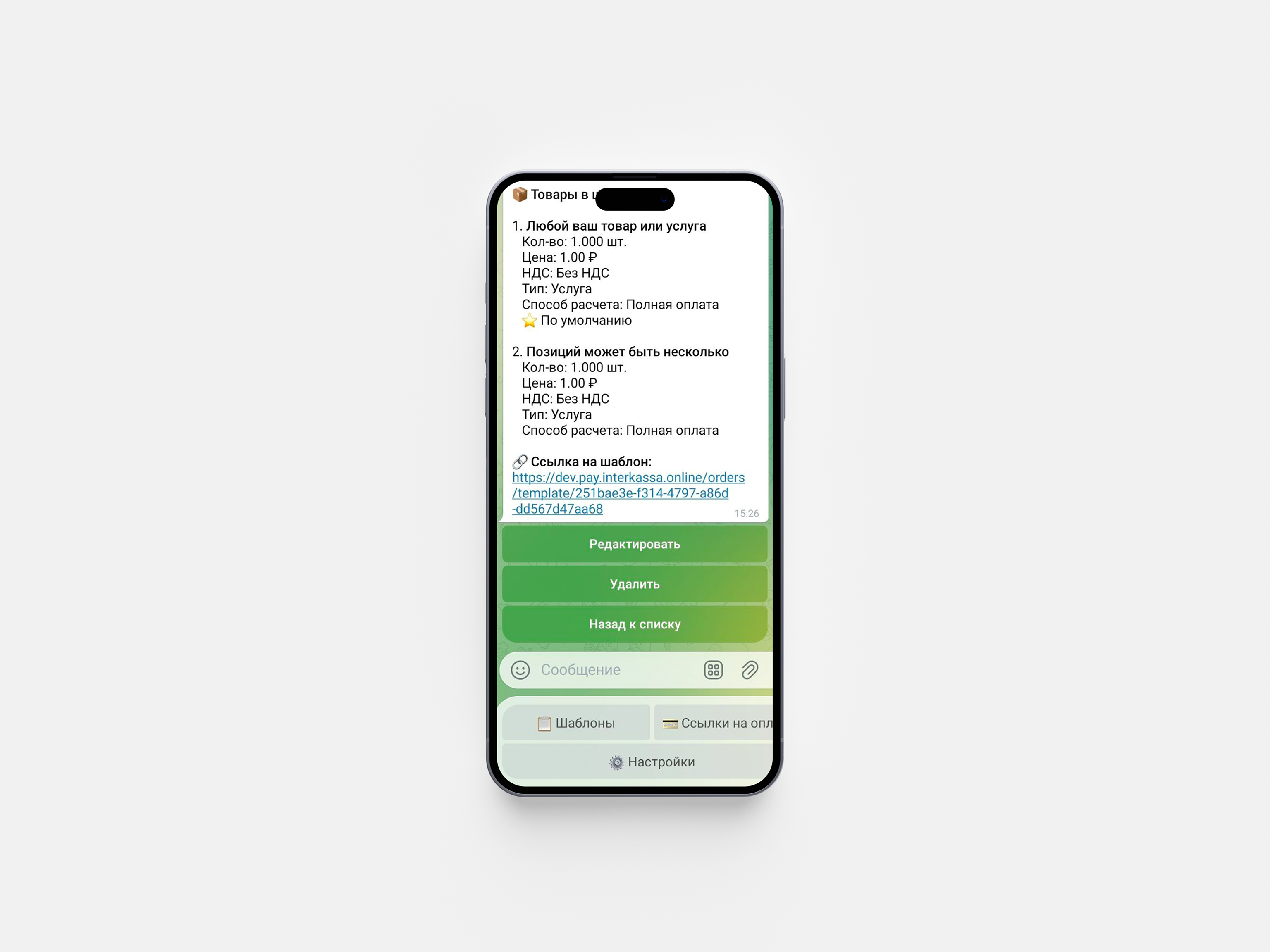 Управляйте оплатами прямо из Telegram: создавайте шаблоны для регулярных услуг и генерируйте платежные ссылки за секунды, не заходя в личный кабинет и не отвлекаясь от переписки с клиентом. Бот возьмет на себя рутину — выберите магазин и провайдеров (СБП, карты, рассрочка), оформите товары и сразу пришлет готовую ссылку на оплату, которую можно тут же отправить клиенту. Вы мгновенно увидите статус платежа и при необходимости получите уведомление о каждой успешной оплате прямо в чате.